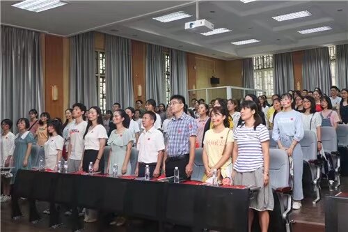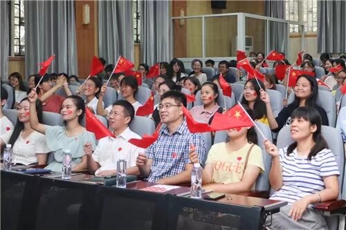 活动伊始,直播镜头转换到了北京天安门。鸣炮声响起,报告厅内人员挥舞手中的国旗,向祖国母亲表达最真挚的祝福。五十六鸣礼炮,七十鸣轰响,分别代表了我国五十六个民族和中国人民共和国度过的七十年风雨岁月。鸣炮完毕后,庄重的国歌奏响,报告厅全体人员齐声和唱。